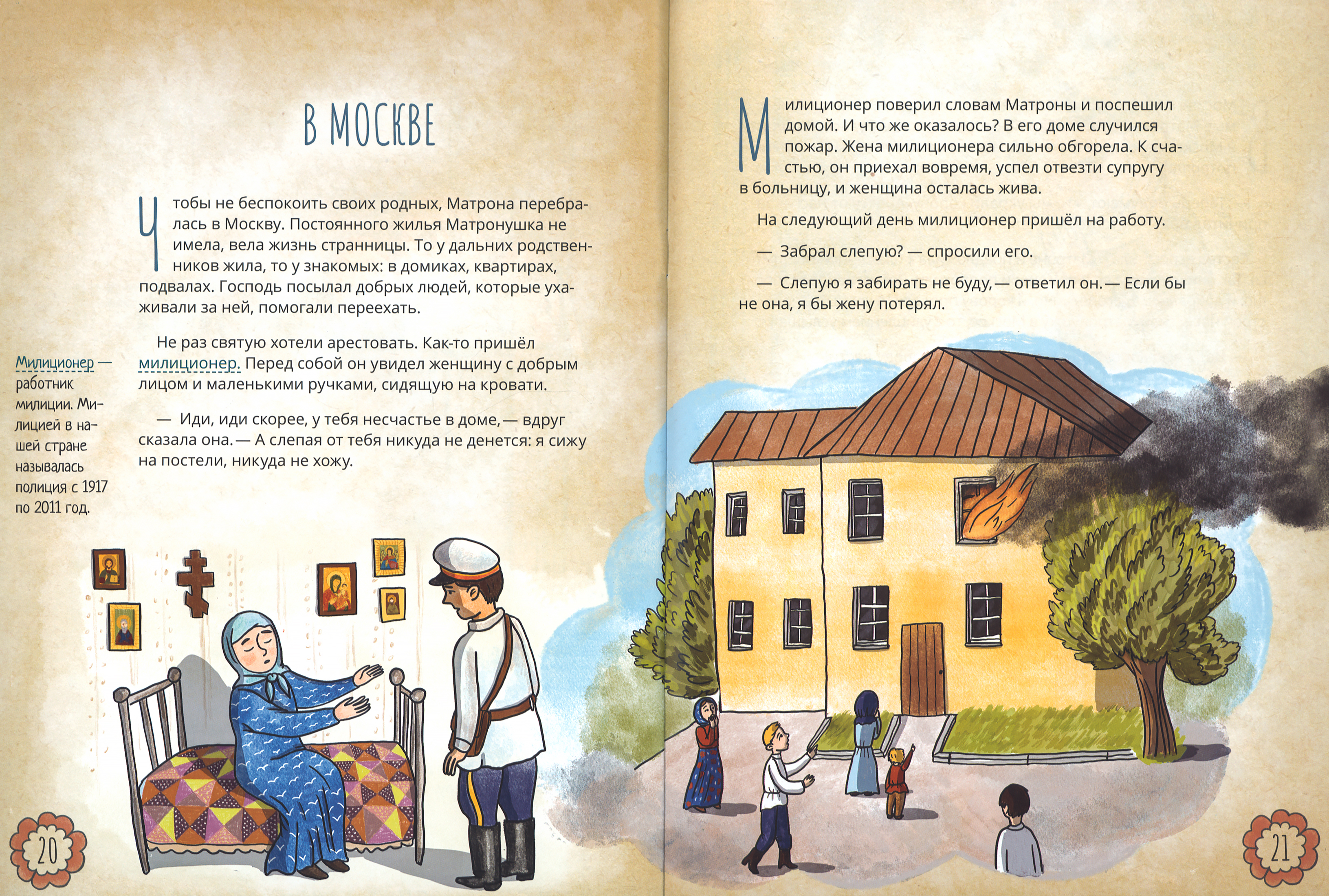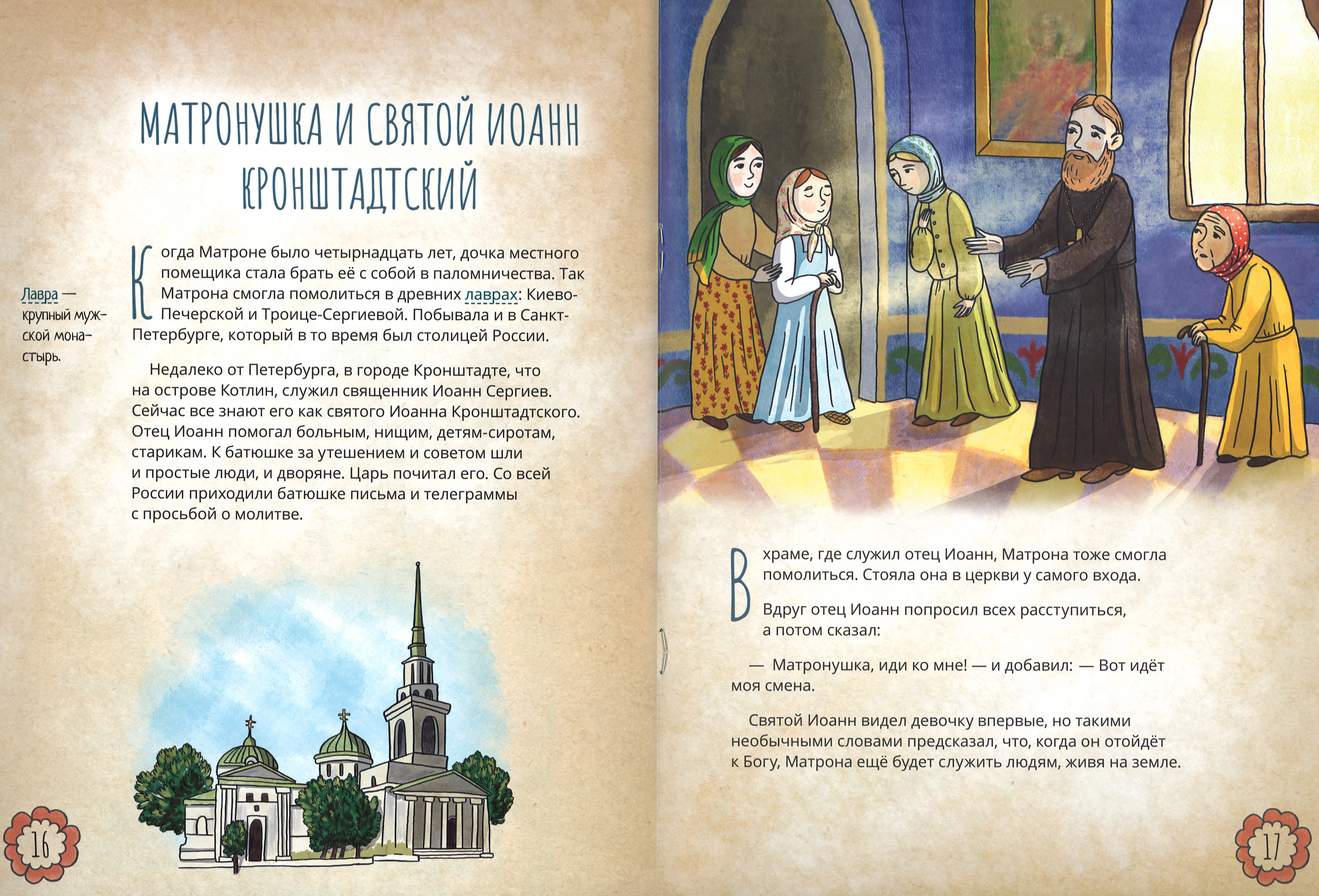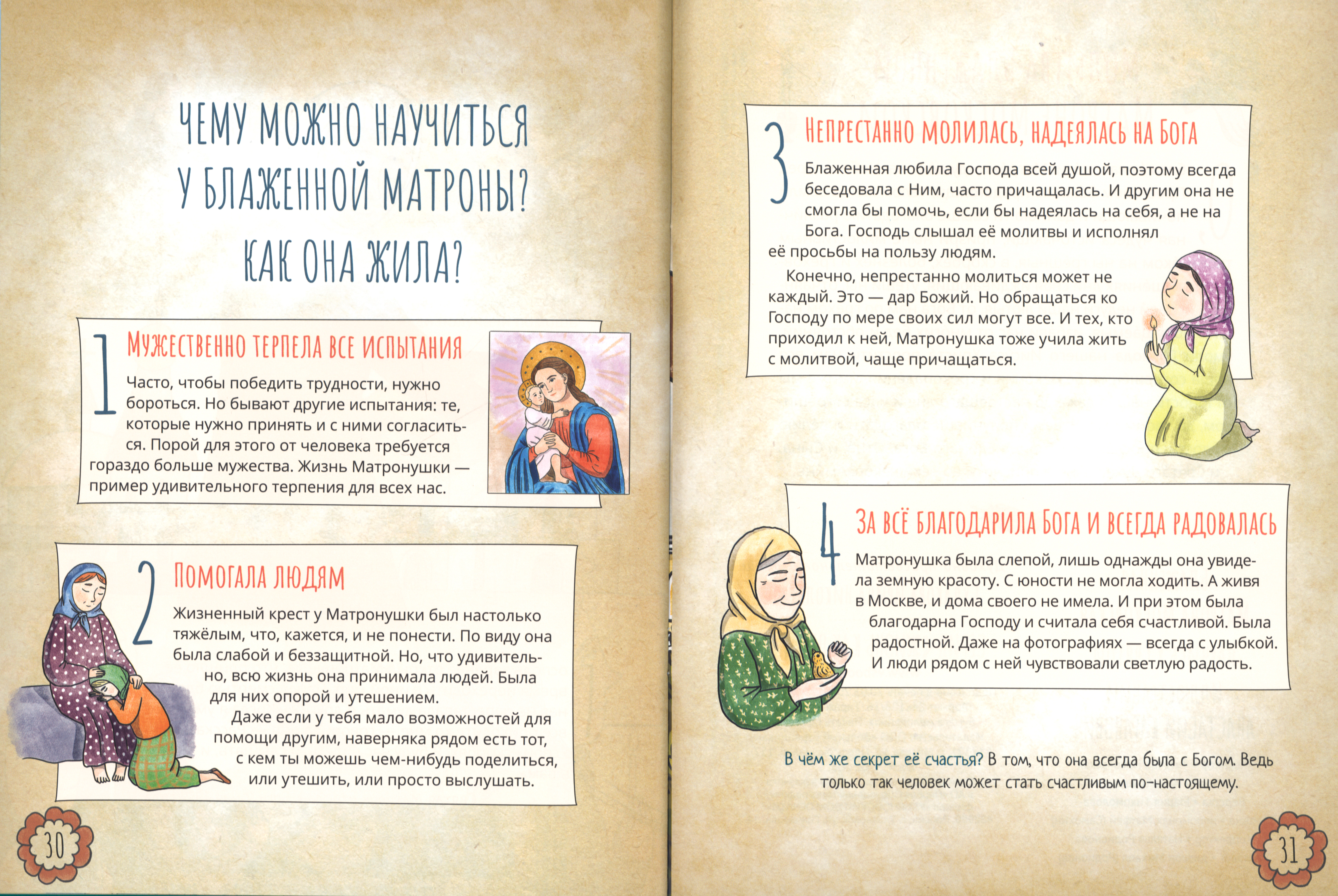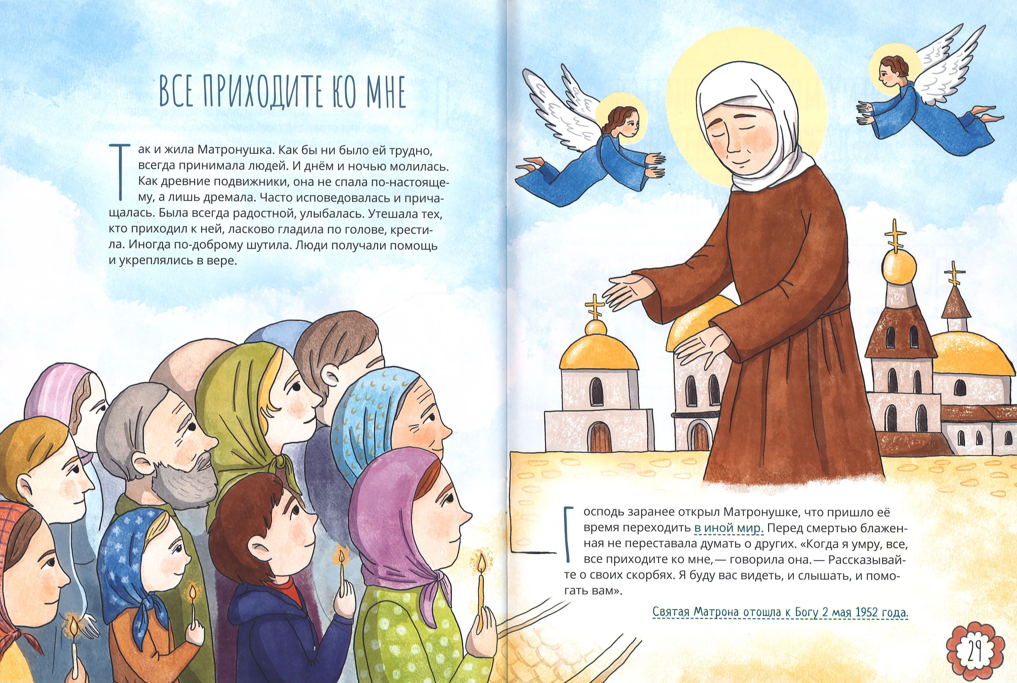 Святая блаженная Матрона Московская очень близка к нам по времени — она жила в XX веке. Люди ласково называют её Матронушкой. И москвичи, и жители всей России едут в Покровский монастырь к ней как к родному человеку: кто-то просит об исцелении, кто-то о помощи в житейских скорбях, кто-то обращается с просьбой об устройстве личной жизни. И ни один человек не отходит неуслышанным, потому-то очередь к её мощам не оскудевает. Перед своей кончиной блаженная Матрона сказала: «Все, все приходите ко мне, рассказывайте, как живой, о своих скорбях, я буду вас видеть, и слышать, и помогать вам». В этой книге рассказывается о нелёгком жизненном пути блаженной старицы.