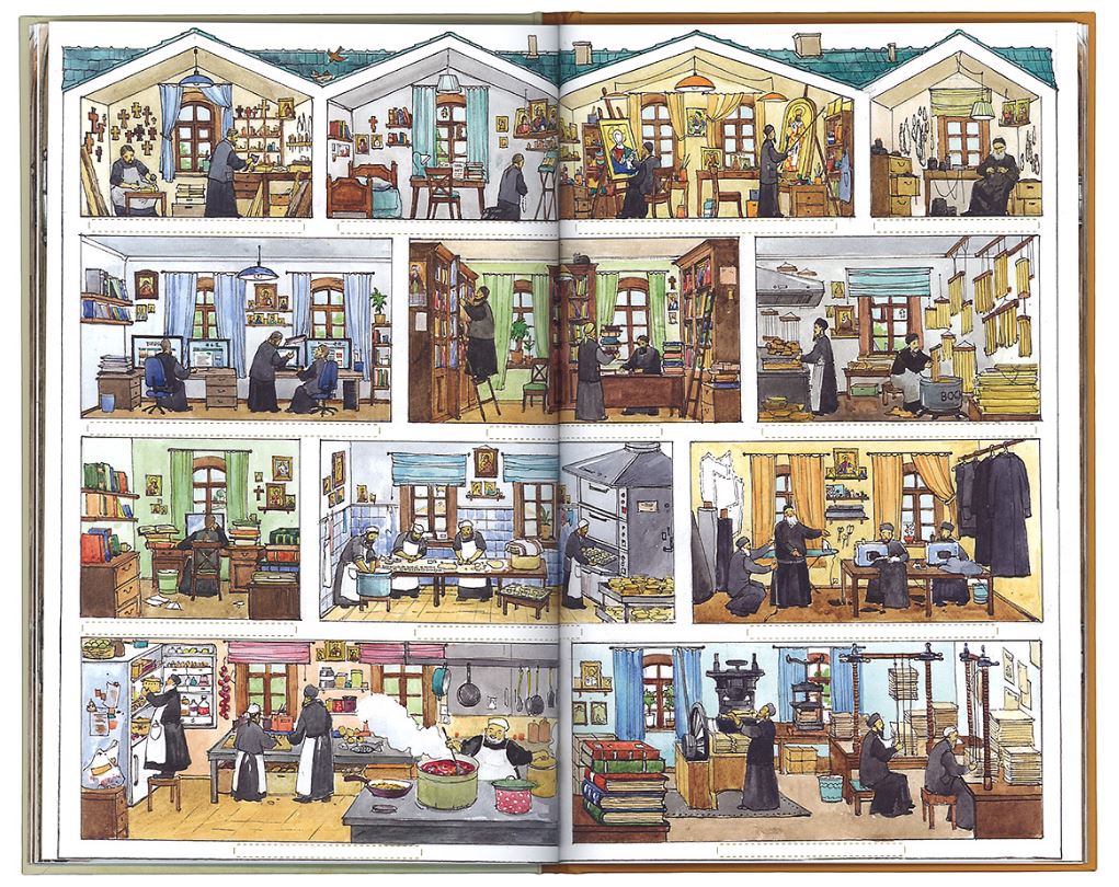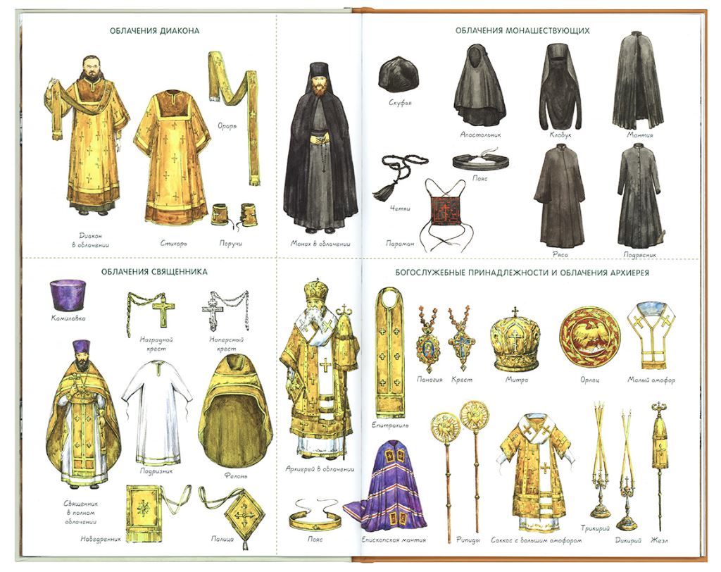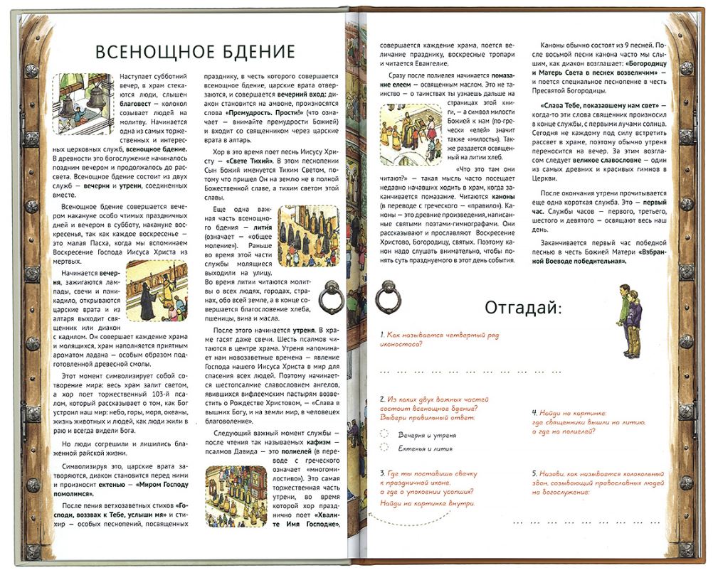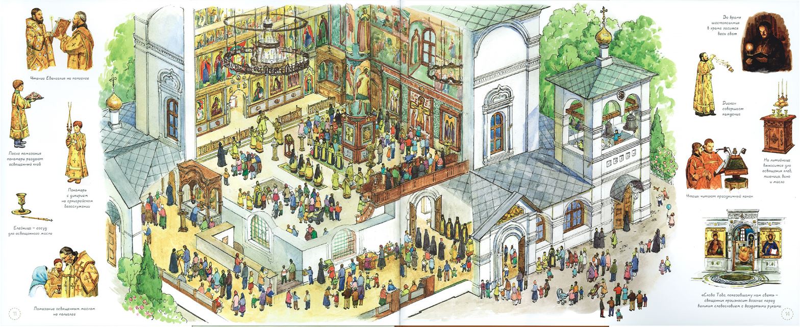Красочно оформленная книга «Я открываю храм», иллюстрации которой подготовлены художницей Елизаветой Цымбаревич, расскажет о том, что такое храм, что такое монастырь, что такое службы и таинства (посмотреть краткий обзор). Отдельный раздел посвящен дому христианина, где богослужение продолжается непрерывно, хотя оно и вплетено в наши повседневные бытовые занятия.
