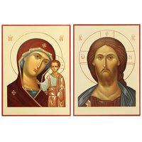 Венчальная пара икон - Господь Вседержитель и Казанская икона Божией Матери. Иконы изготовлены из массива липовой доски. Печать выполнена прямым нанесением красок на специально подготовленную поверхность доски и отличается высокой точностью цветопередачи. Краска обладает светостойкостью и не боится влаги. Подготовка и обработка иконной доски произведены вручную православными мастерами. Иконы с золочением и покрытием лаком.
