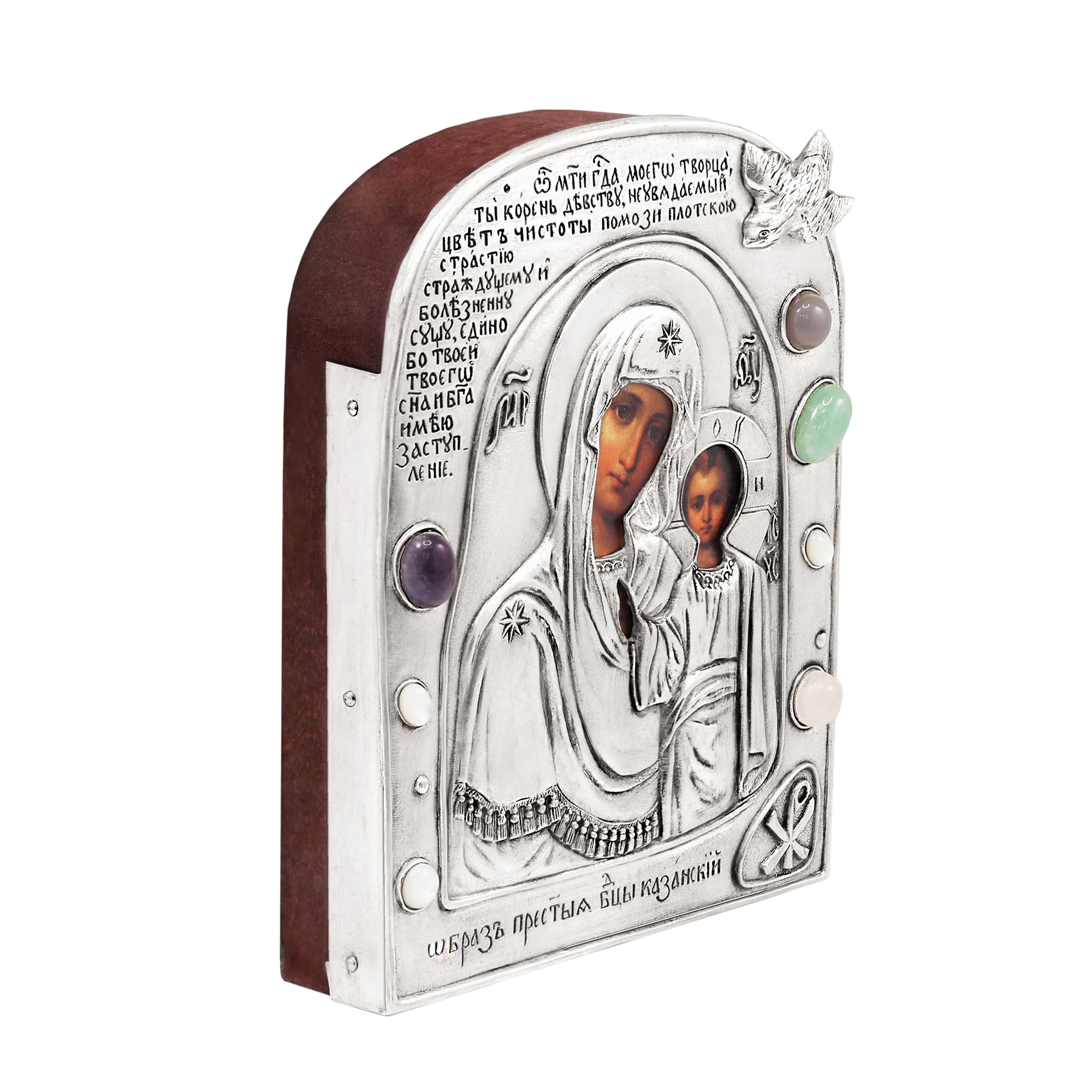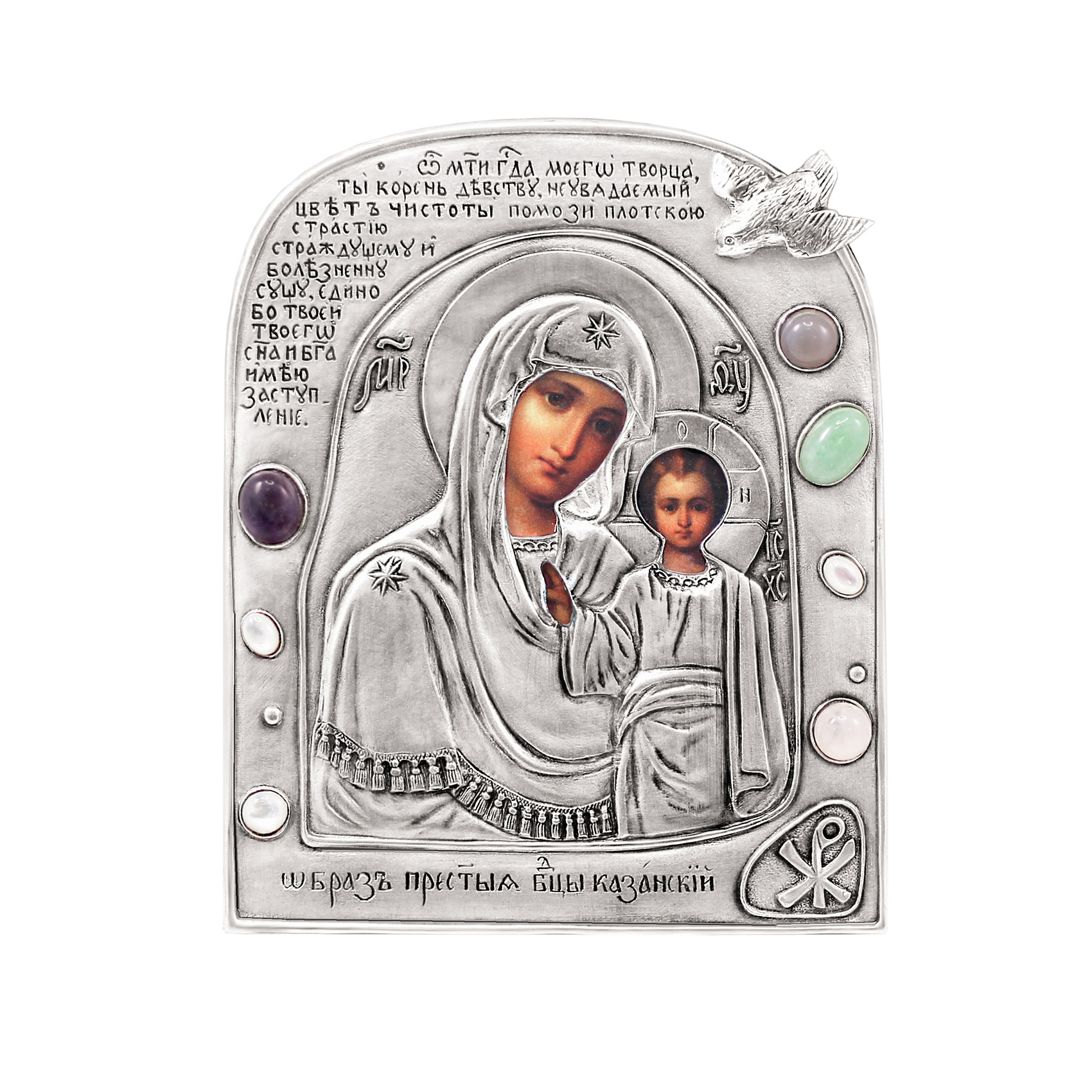 Небольшая икона Богородицы "Казанская" в уникальном авторском гальваническом окладе похожа по дизайну на изделие из музеев византийского искусства. Оклад украшен разноцветными камнями, хризмой и изображением голубицы, древними христианскими символами.