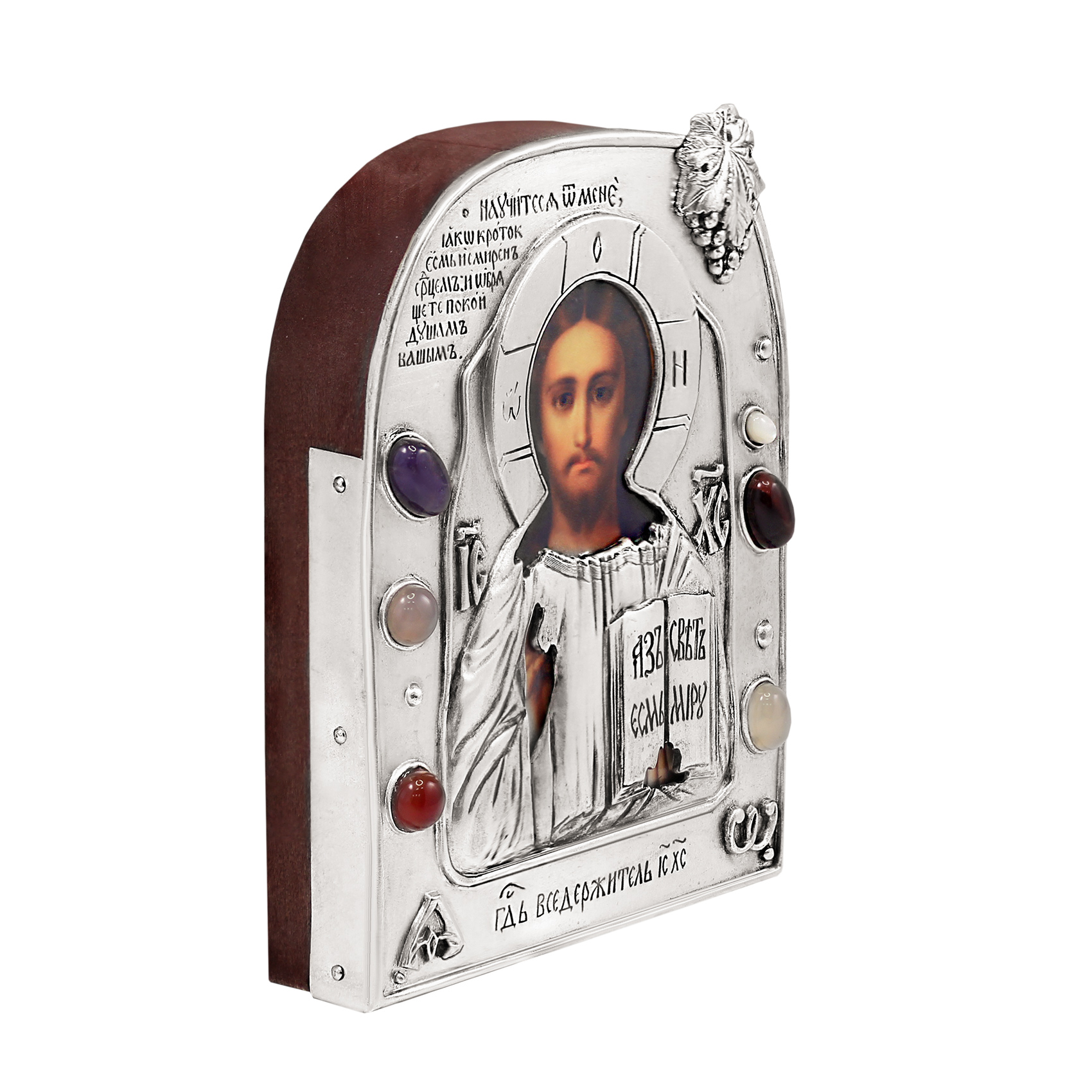 Небольшая икона Спасителя в уникальном авторском гальваническом окладе похожа по дизайну на изделие из музеев византийского искусства. Оклад украшен разноцветными камнями, виноградной лозой и изображением греческих букв альфа и омега, древними христианскими символами.