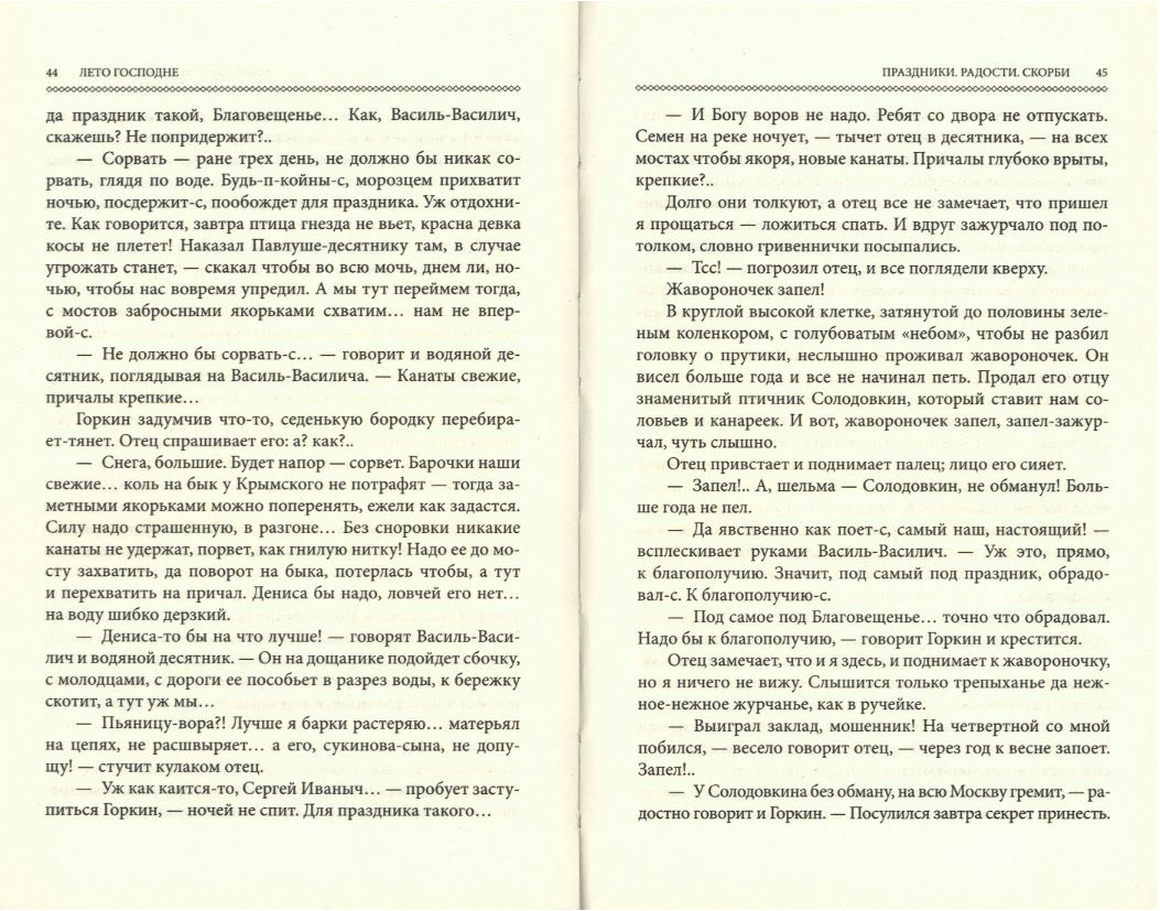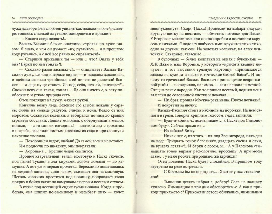 Роман «Лето Господне» по праву можно назвать вершиной творчества Ивана Шмелёва. Книга, работа над которой продолжалась с 1933 по 1948 годы, состоит из трех частей: «Праздники», «Радости» и «Скорби».