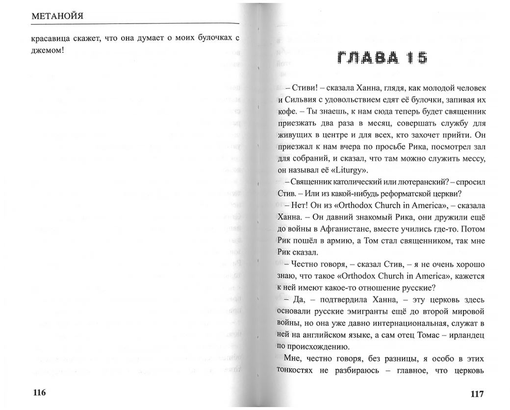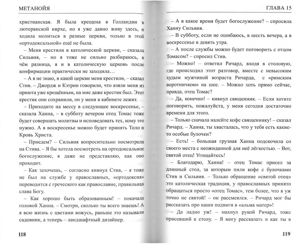 Сюжет новой книги протоиерея Александра Торика «Метанойя» достаточно необычен. Главная героиня Сильвия загадочным образом и неожиданно для самой себя оказывается освобождённой из тюрьмы. Её спасает некий молодой человек и привозит в свой особняк, где обеспечивает жильем, едой и деньгами. Позже выясняется, что этот мужчина – хакер и член влиятельной подпольной организации. Он объясняет девушке, что в прошлом его предки были рабовладельцами, а предки Сильвии из тех, кто молился о спасении их душ. И теперь он ищет способ отблагодарить ее, поскольку молитвы оказались не напрасны. Однако другие члены хакерской организации не поддерживают стремления помогать простым людям и объявляют на него охоту.