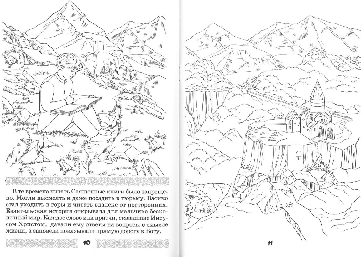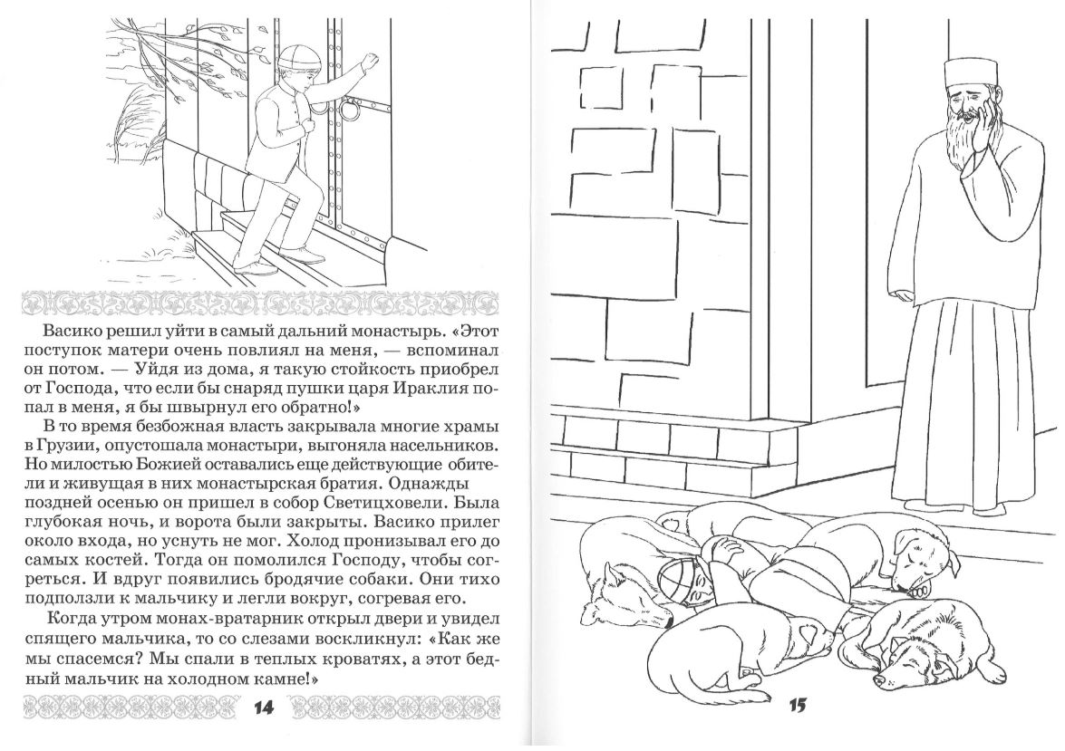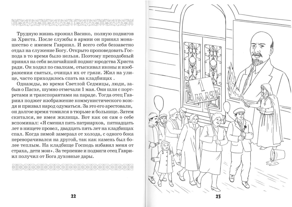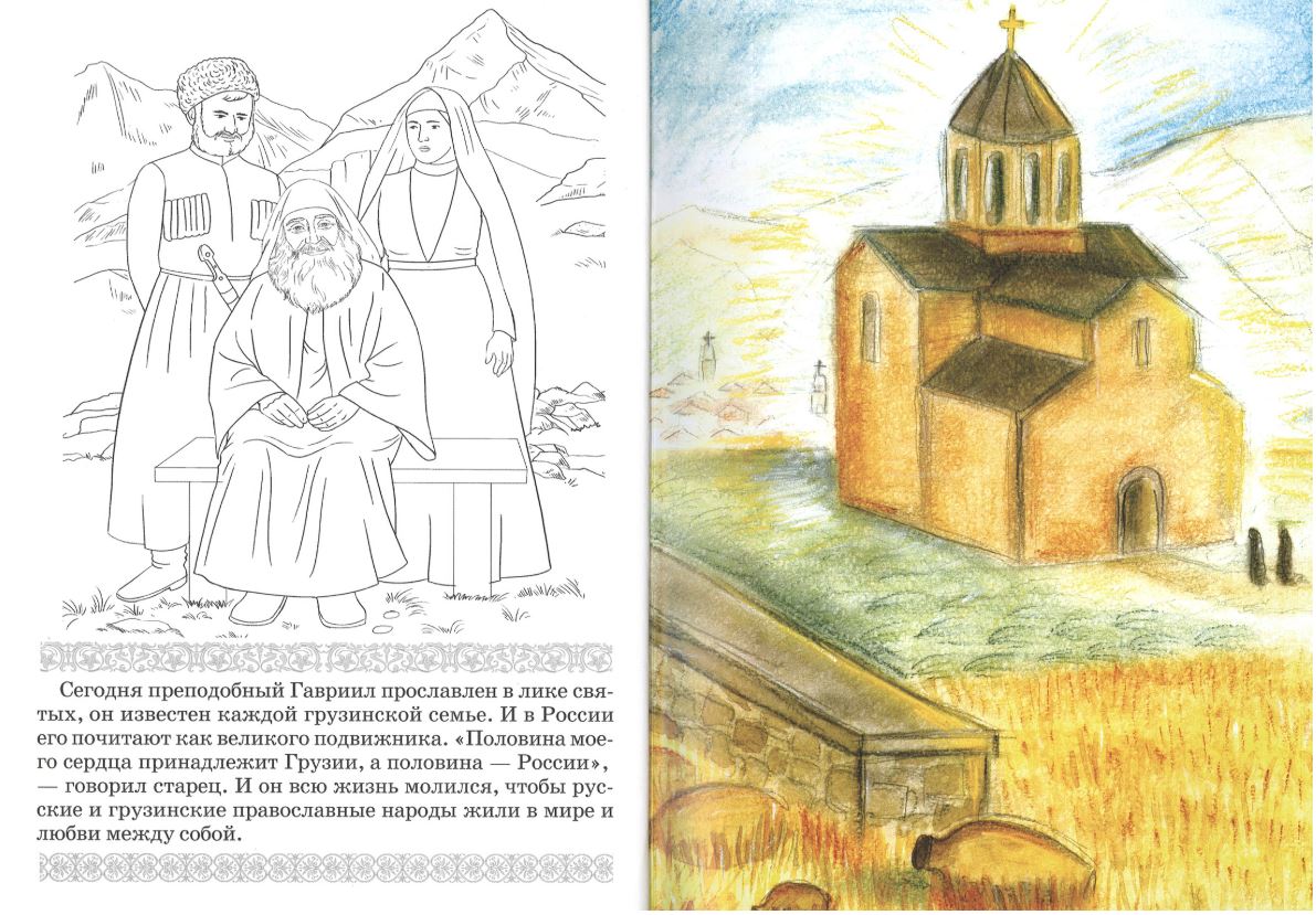 Книжка-раскраска знакомит с детством великого подвижника современности преподобного Гавриила Самтаврийского, Христа ради юродивого. 26 августа 1929 года в Тбилиси в семье Васико и Варвары Ургебадзе родился сын Годердзи. Отец его рано умер, и мальчика, в честь отца, стали называть Васико. В раннем возрасте он открыл для себя имя Господа нашего Иисуса Христа и до самой смерти нес в себе веру в Него. Жизнь преподобного прошла в Грузии — Древней Иверии. Но сердце его всегда было наполовину в России, как он сам выражался. Он прославлен не только в Грузии, но и в Русской Православной Церкви.