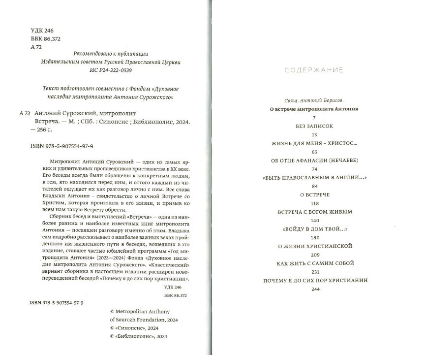 Сборник бесед и выступлений "Встреча" - одна из наиболее ранних и наиболее известных книг митрополита Антония - посвящен разговору именно об этом. Владыка сам подробно рассказывает о наиболее важных вещах пройденного им жизненного пути в беседах, вошедших в это издание, ставшее частью юбилейной программы "Год митрополита Антония" (2023-2024) Фонда "Духовное наследие митрополита Антония Сурожского". "Классический" вариант сборника в настоящем издании расширен новопереведенной беседой "Почему я до сих пор христианин".