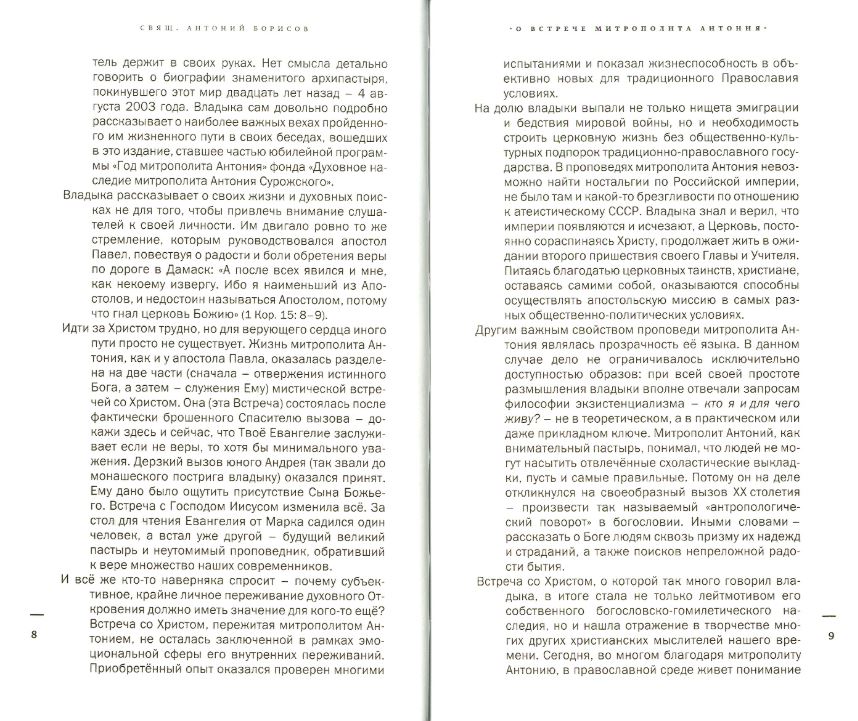 Митрополит Антоний Сурожский - один из самых ярких и удивительных проповедников христианства в XX веке. Его беседы всегда были обращены к конкретным людям, к тем, кто находился перед ним, и оттого каждый из читателей ощущает их как разговор лично с ним. Все слова Владыки Антония - свидетельство о личной Встрече со Христом, которая произошла в его жизни, и призыв ко всем нам такую Встречу обрести.